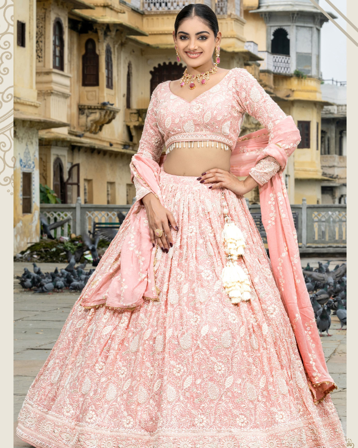With our blush pink embroidered lehenga choli set, you can embrace classic elegance. It's the...
