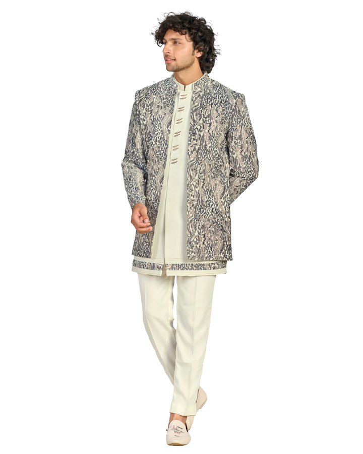 Make a lasting impression with this stunning Ivory Embroidered Indo-Western Sherwani Set, designed for the...