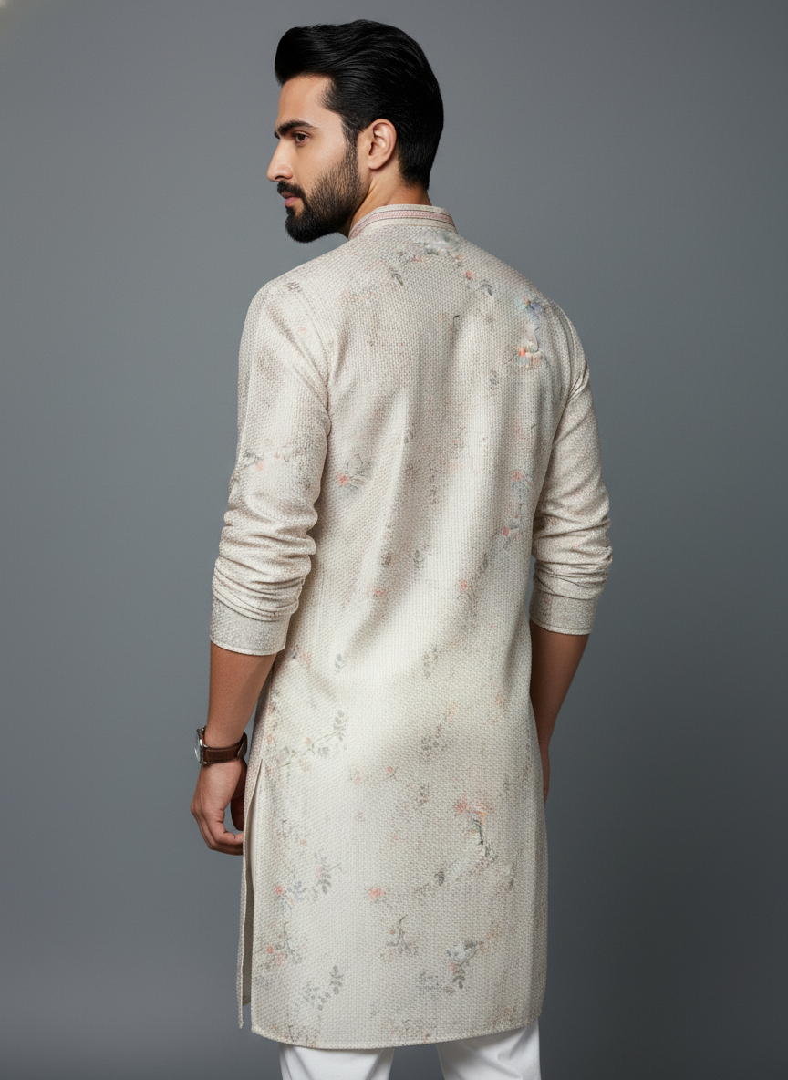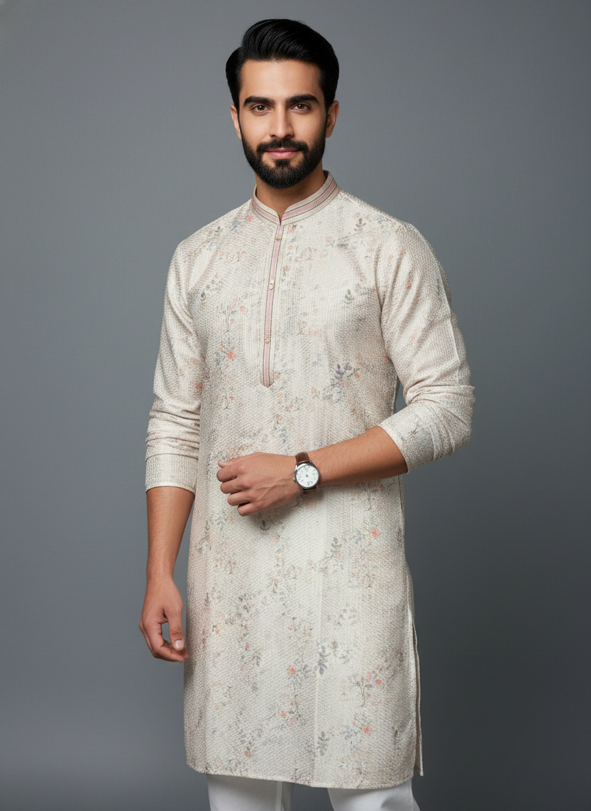 Step into timeless elegance with the Ivory Bloom Premium Kurta Set, designed for the modern man who appreciates subtle luxury and refined tradition. Crafted in a soothing ivory tone with delicate floral detailing, this ensemble delivers effortless sophistication for festive and celebratory occasions.