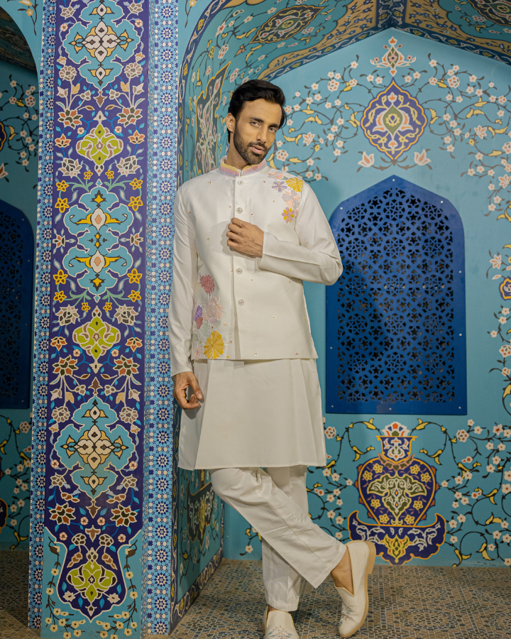 Step into refined elegance with this ivory kurta set, paired with a beautifully detailed hand-embroidered jacket. Crafted from premium blended silk, the outfit offers a luxurious sheen and feather-soft comfort. The jacket features delicate multicolour floral embroidery that adds a soft, artistic charm without overpowering the clean minimal aesthetic. Perfect for daytime weddings, festive ceremonies, engagements, or cultural celebrations, this ensemble blends sophistication with modern simplicity—making it a standout choice for any special occasion.
