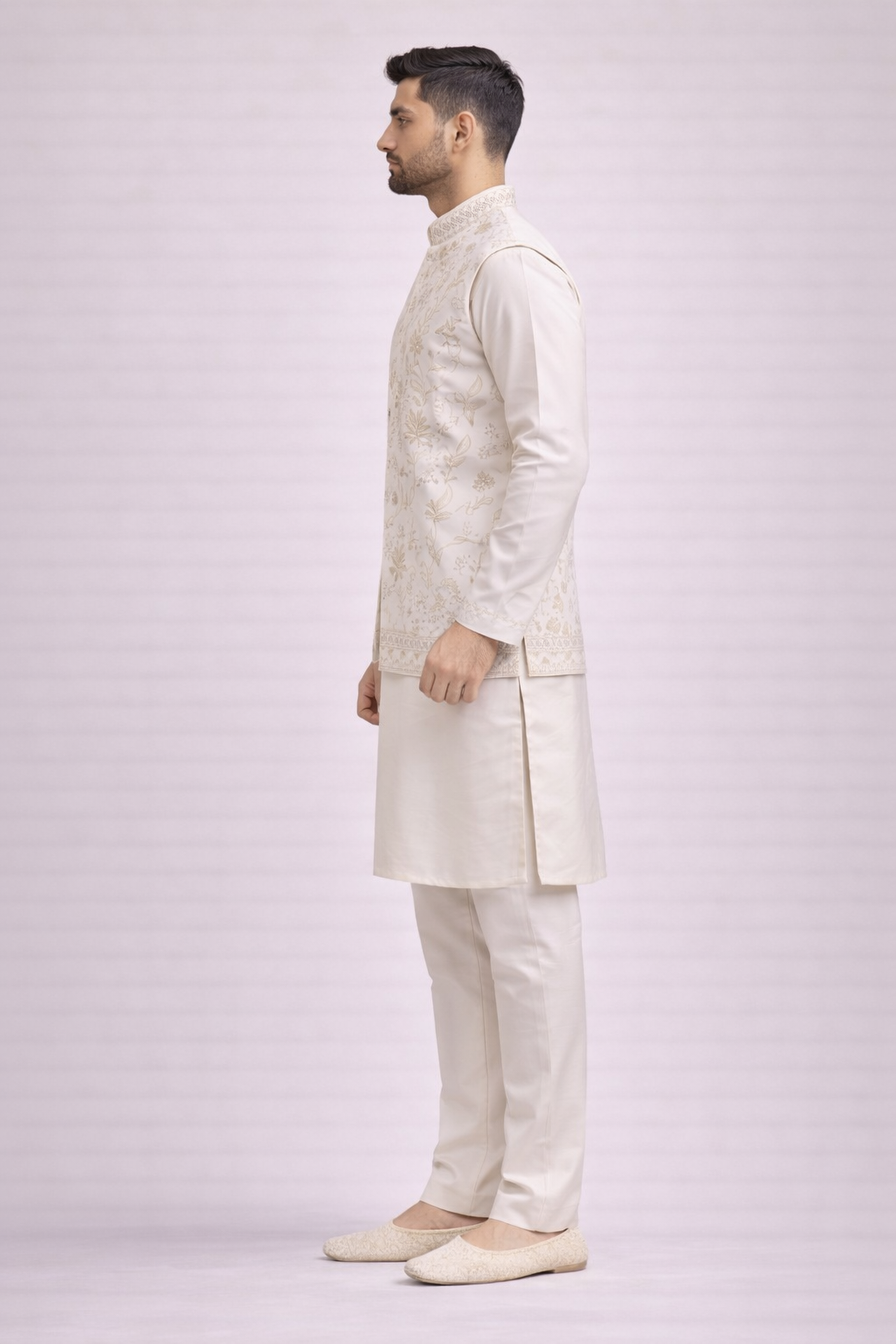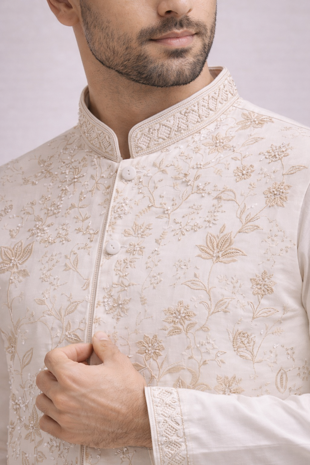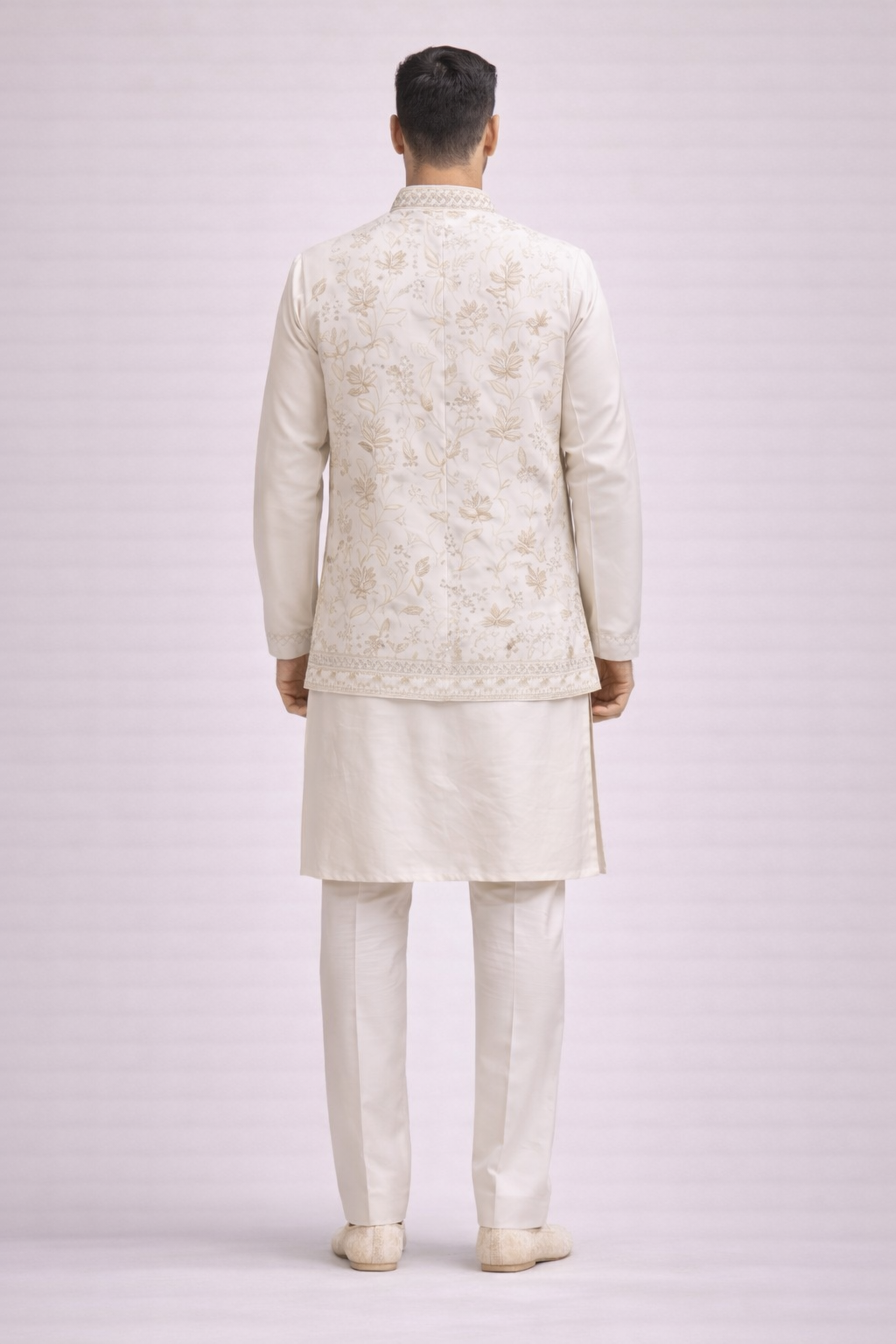 Designed with a structured silhouette and detailed mandarin collar, the outfit blends traditional craftsmanship with modern elegance. Paired with a coordinated kurta and matching pants, this ensemble offers a polished and graceful appearance.