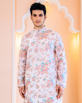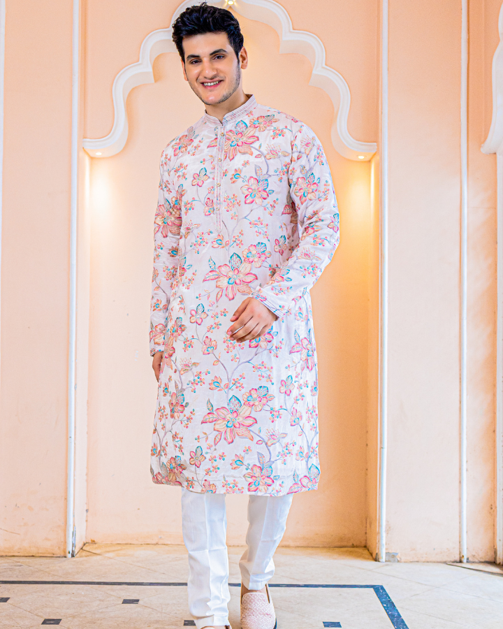 Refresh your festive wardrobe with this elegant white floral printed kurta set, designed to offer a soft, sophisticated, and youthful charm. The kurta, which is made of high-quality blended silk, has delicate pastel floral prints that give its clean white background a revitalizing touch. It is perfect for daytime celebrations, poojas, haldi events, or family get-togethers because of its elegant appearance, which is enhanced by the mandarin collar and simple silhouette. This ensemble strikes the ideal balance between tradition and modern freshness; it is light, cozy, and effortlessly fashionable.