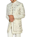 Make a lasting impression with this stunning Ivory Embroidered Indo-Western Sherwani Set, designed for the modern man who values both tradition and style. Crafted with care from premium fabric, this sherwani beautifully blends classic Indian artistry with a contemporary silhouette. The soft ivory tone is enhanced by delicate floral and paisley embroidery in subtle pastel shades, while the bandhgala collar and hand-embroidered buttons add a regal touch. Paired with matching ivory trousers, this ensemble exudes elegance and sophistication—perfect for weddings, festive celebrations, and special occasions alike.