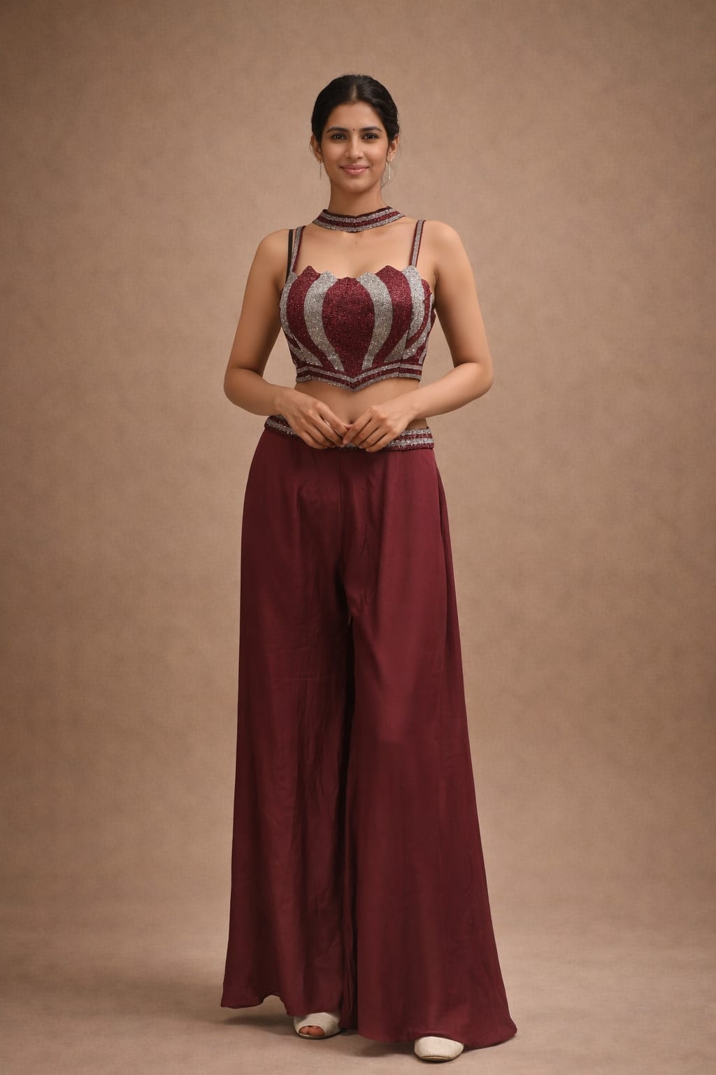 Paired with flowing wide-leg palazzo pants, this outfit offers both comfort and elegance, making it perfect for weddings, festive celebrations, parties, and special occasions. The rich wine color enhances its luxurious appeal, while the subtle embroidery detailing adds a graceful sparkle to the ensemble.