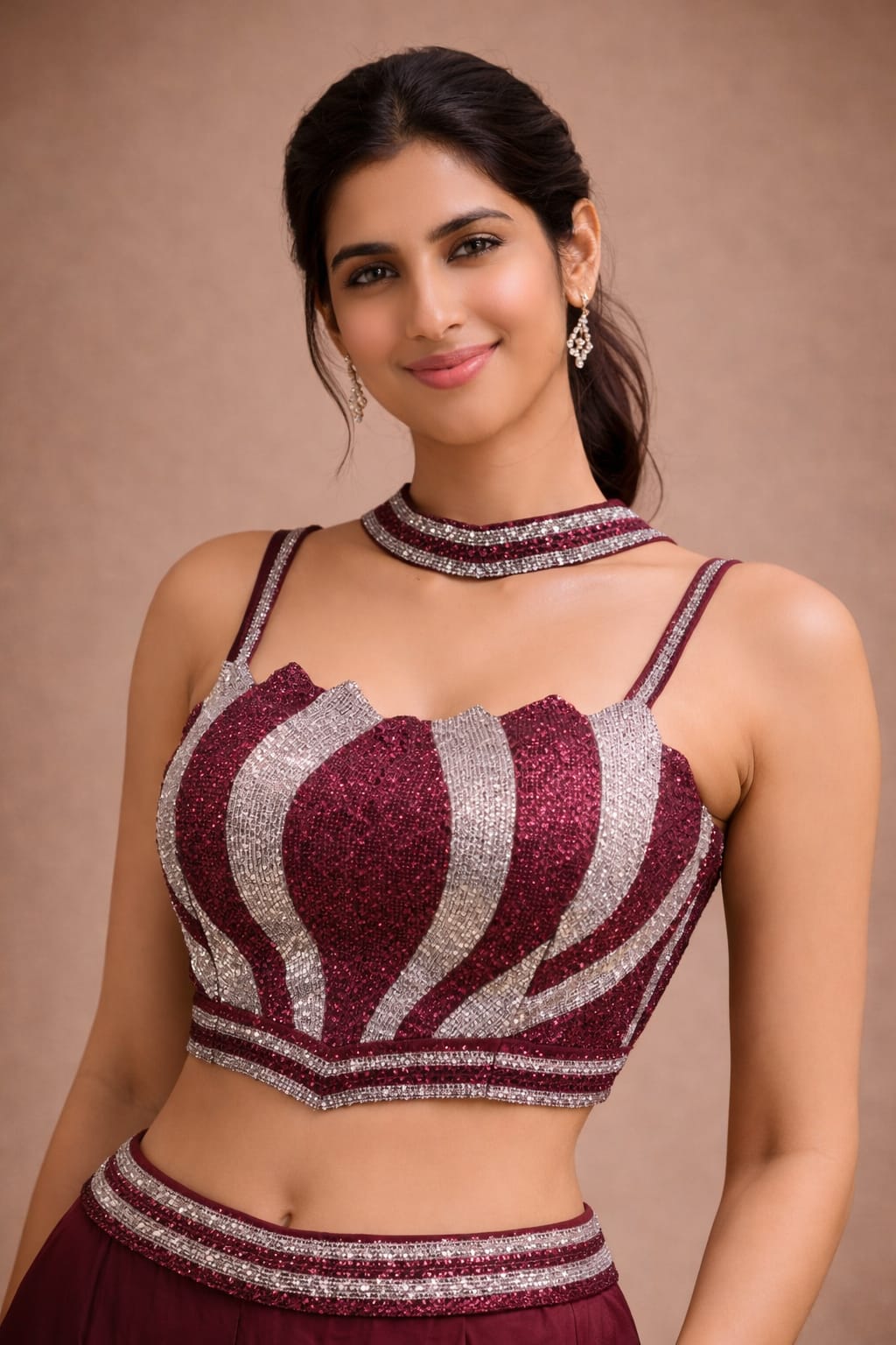 Elevate your festive wardrobe with this elegant wine maroon embroidered Indo-Western with plazo, designed to deliver a perfect blend of modern glamour and ethnic sophistication. The stunning crop top features intricate shimmer embroidery with a stylish structured neckline that adds a contemporary touch to traditional attire.